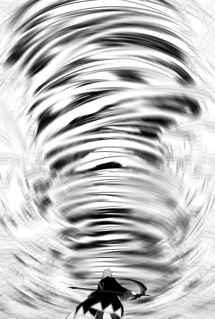 Rei’s magic was so powerful that his flames would erode the wind tornado. But with the Wind Hand extending out from the Death Scythe and coming in contact with both tornadoes, the magic in Rei’s Wind Hand was passed onto Set’s tornado. The wind tornado, that had been about to be swallowed up by the flame tornado, suddenly increased in power, reaching the same size as the flame tornado. The moment after they overlapped, the two tornadoes fused as the wind caught the flames.
